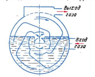 Un tel compteur fonctionne sur le principe du déplacement. Dans le liquide barrière - eau, huile - le tambour tourne sous l'influence de la pression. Dans ce cas, 4 chambres de mesure sont remplies et vidées. Le volume de gaz dans ce cas est mesuré directement. Un étalonnage minutieux de la caméra garantit une très grande précision de mesure.
