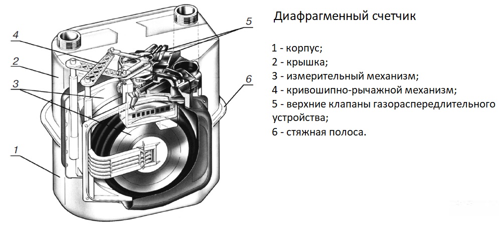 - Le compteur à diaphragme est divisé en 2 chambres ou plus. Chacun est relié au mécanisme de soupape, et un compteur est relié à l'arbre de ce dernier.