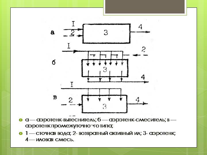 Le principal inconvénient est une diminution de la qualité du nettoyage avec une forte modification de la teneur en matière organique et en substances toxiques. Avec un débit d'eaux usées uniforme, l'utilisation de bassins d'aération à déplacement est préférable en raison de leurs petits volumes et de leur simplicité de conception. Ils sont subdivisés en sectionnés et couloir.