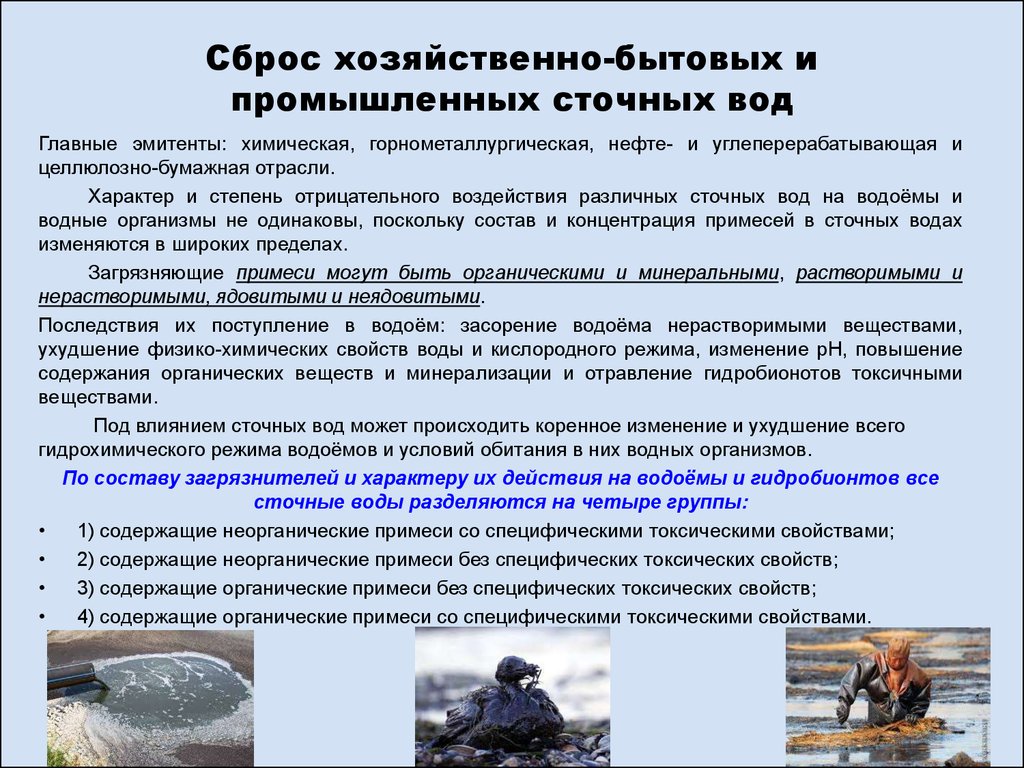 Les eaux usées des complexes industriels sont extrêmement dangereuses, car elles peuvent contenir des déchets radioactifs et des produits chimiques toxiques. Les exigences les plus strictes sont appliquées à ces fluides, et les propriétaires d'installations de production doivent assurer un traitement préalable des effluents avant leur entrée dans le réseau de la ville afin d'éviter une catastrophe environnementale ou une épidémie de maladies infectieuses.