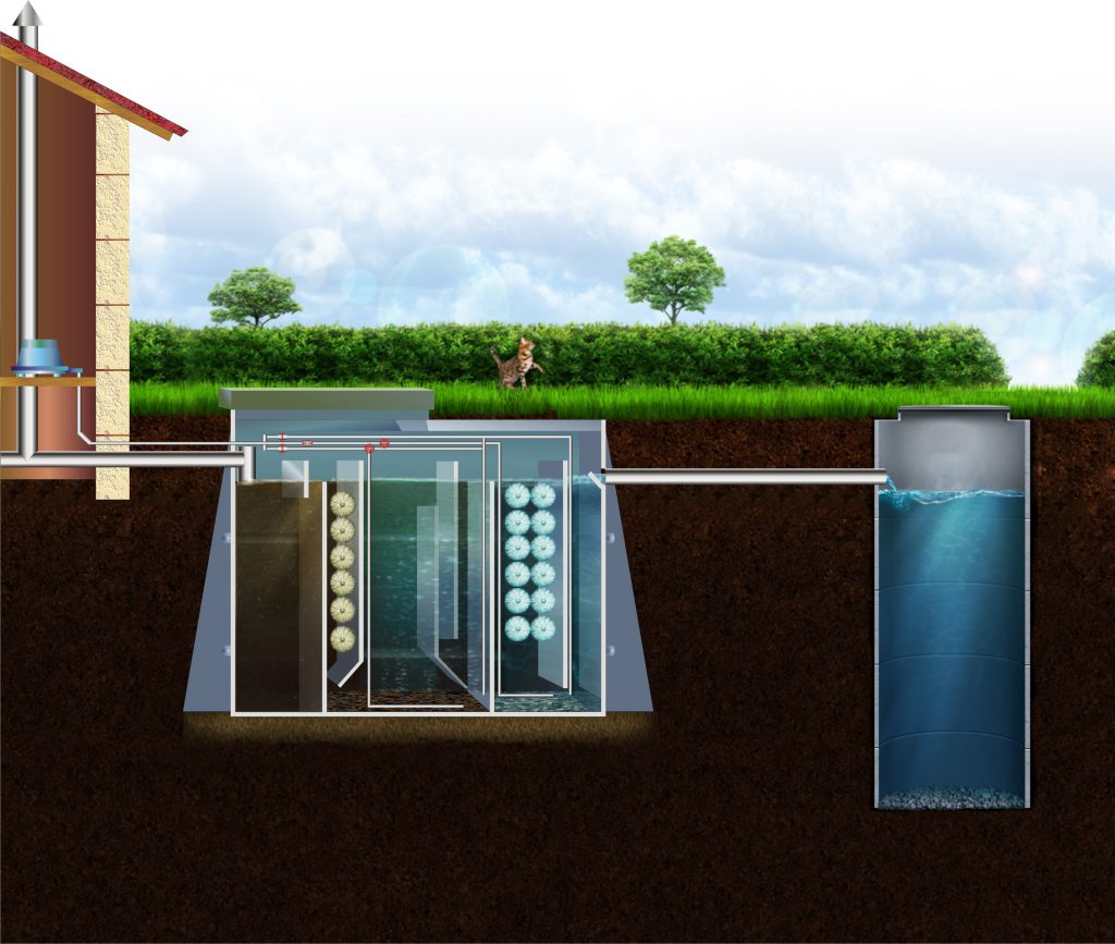 Lors du processus d'épuration, les eaux usées traversent plusieurs chambres (récepteur, bassin d'aération, puisard et section de finition), chacune ayant sa propre fonction. Le récepteur sert à l'accumulation des effluents et à la séparation des fractions. Le processus d'aération à fines bulles a lieu dans le réservoir d'aération. La pompe à jet (airlift) pompe l'eau du réservoir vers le réservoir d'aération et la sature activement en air. Dans le réservoir aérobie, les bactéries aérobies déclenchent la décomposition de la matière organique. Le puisard sert de traitement secondaire.