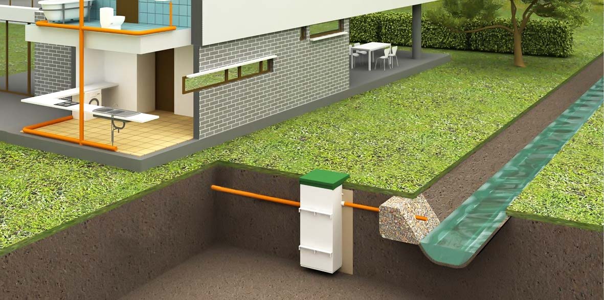 - Réseaux d'égouts extérieurs (conduites menant de la maison aux fosses septiques, toujours avec une pente, de sorte que l'eau se déplace par gravité);