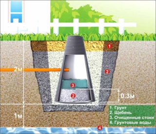 Dans tous les cas, la profondeur des trous doit être inférieure au niveau de la fondation et du gel du sol, à l'exclusion de la destruction et de l'inondation des niveaux inférieurs de la maison. De la pierre concassée ou de l'argile expansée sont coulées afin que les murs ne s'effondrent pas, ce qui réduit le diamètre. En présence d'un tuyau, ces matériaux sont versés à l'intérieur pour la filtration, de nombreux trous sont pratiqués dans toute la structure. D'en haut, la structure est fermée par un couvercle et saupoudrée de terre.