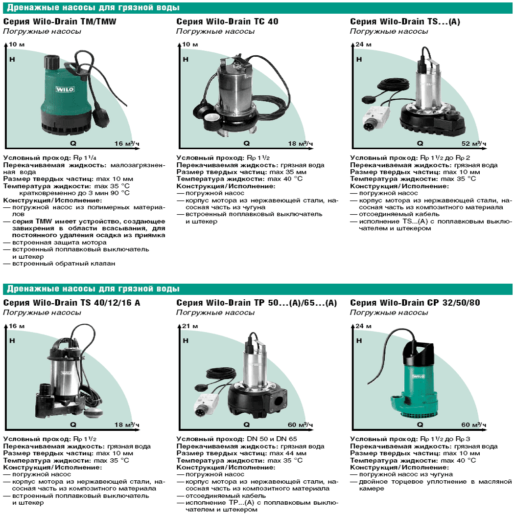 - WILO DRAIN VC 32 ET 40 - l'unité est conçue pour l'eau à haute température, ainsi que certains composés agressifs avec une taille admissible de particules solides ne dépassant pas 8 mm. L'unité fonctionne en position verticale, équipée d'un thermostat intégré et d'un support. Il a une classe de protection contre l'humidité IP54, la hauteur de chute atteint 20 m, le débit est de 14 mètres cubes/heure. Les deux moteurs tournent à 2900 tr/min par minute.