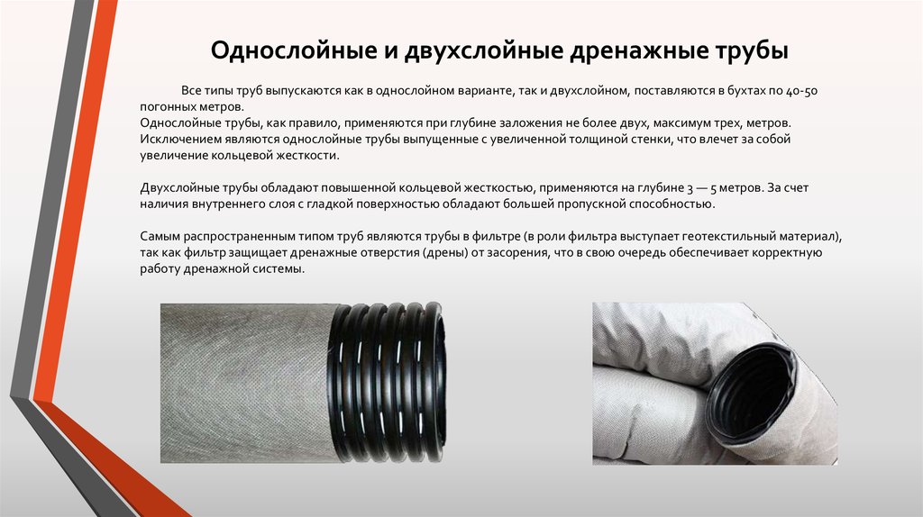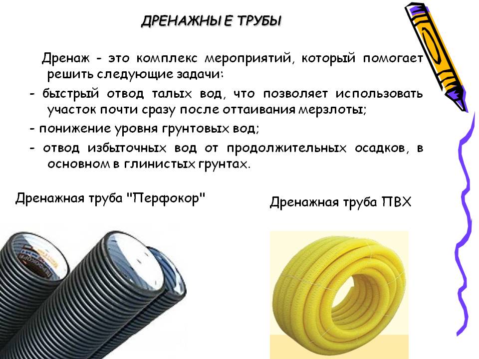 Auparavant, on utilisait des produits en amiante-ciment et en céramique, mais maintenant ils utilisent des versions polymères de tuyaux perforés. Ils sont plus légers, plus faciles à installer, moins chers et plus résistants aux influences extérieures négatives. Avec leur faible poids, ils ont des caractéristiques de rigidité élevées, qui leur sont données par des nervures spéciales qui contribuent à une répartition uniforme de la charge même à de grandes profondeurs.