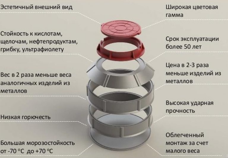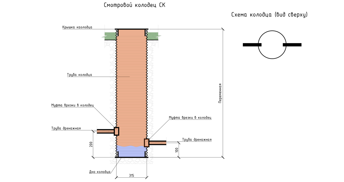 - le puits lui-même, ayant un sommet en forme de cône avec une trappe, un "corps" ondulé scellé ou avec des tuyaux pour entrer dans les tuyaux, un fond en polymère ou un plateau pour disposer un coussin de pierre concassée de sable.
