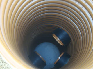 - Le conteneur collecté est placé au fond. Les coudes des tuyaux peuvent être découpés après l'installation du réservoir.