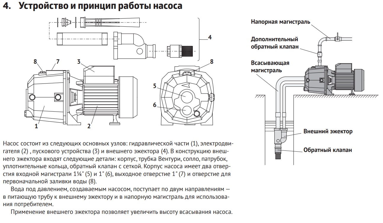 Ces derniers sont installés à la surface de la terre près du lieu de prise d'eau; un tuyau d'aspiration spécial est installé au fond du réservoir du puits. Le mécanisme à flotteur nécessaire au bon fonctionnement du système d'eau est monté à faible hauteur par le bas, et il allume ou éteint automatiquement le système en fonction du niveau d'eau dans le réservoir.
