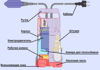 Le corps de la pompe est en métal ou en plastique, dans lequel se trouvent les unités de travail, garantissant des performances élevées de l'appareil. Une roue avec une roue en spirale est installée sur l'arbre du moteur et le moteur électrique est situé dans un boîtier métallique scellé séparé. La partie inférieure est équipée d'une grille spéciale à travers laquelle s'écoule le liquide aspiré. La taille des trous est calculée en fonction des diamètres admissibles d'impuretés solides dans le liquide, avec lesquels l'unité est capable de travailler sans perte de puissance et de productivité.