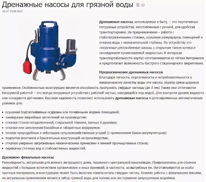 Les pompes de drainage ont de nombreuses configurations et sont demandées dans de nombreuses industries, la construction et l'agriculture. Avec leur aide, il sera possible de construire un système d'approvisionnement en eau et d'assainissement dans les maisons de campagne et privées, ainsi que de pomper l'eau dans les pièces inférieures et les sous-sols en cas d'inondation.
