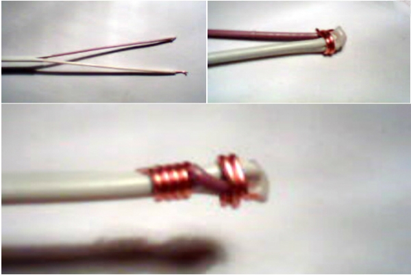 - Chacune des veines devra être dénudée et enroulée en 5 tours autour d'un tube métallique. Une distance de plusieurs millimètres est maintenue entre les spires. Ils ne doivent pas se toucher. Sinon, il y a un risque de court-circuit.