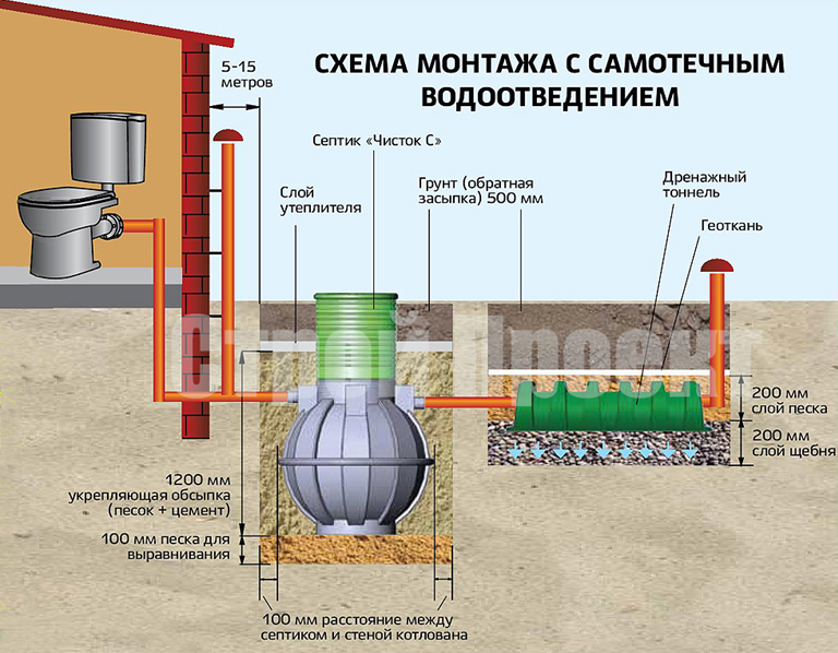 Le type de sol sur le site doit être pris en compte. Si les sables prédominent, alors ils équipent les champs de filtration. Dans ce cas, le réservoir peut être plus petit.Si le sol est argileux, il faut penser à installer une station de traitement biologique afin que les eaux usées ne tombent pas dans le sol. Si les eaux souterraines s'approchent de la surface de la terre, il est possible que les eaux de ruissellement pénètrent dans l'eau potable.