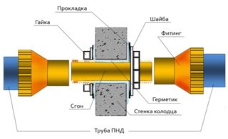 L'entrée est l'endroit où le tuyau d'égout pénètre dans le puits constitué d'anneaux en béton armé. Pour cela, un trou est fait dans l'un d'eux, généralement le supérieur. Il doit être légèrement plus grand que le diamètre du tuyau d'égout.