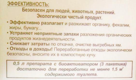 Le contenu de la fosse doit contenir du liquide. Si cela ne suffit pas, ajoutez de l'eau dans le récipient. Les déchets recyclés sont respectueux de l'environnement et peuvent être mélangés avec du compost. L'agent biologique n'est pas destiné au nettoyage des canalisations d'égouts, il est utilisé dans les stations d'épuration pour éliminer les odeurs et la décomposition des matières organiques, les matières fécales.