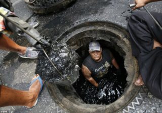 - Après être descendus dans la fosse, ils retirent le limon accumulé avec une pelle et utilisent un seau sur un câble pour le soulever.
