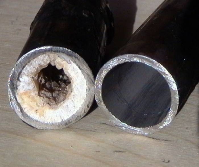 - Les tuyaux en fonte se bouchent en raison de la formation de bosses de rouille à l'intérieur. Le plus souvent, une telle plaque apparaît dans le tuyau de l'évier de la cuisine au bain;