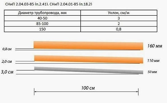 Pente minimale pour les tuyaux de drainage de différents diamètres selon SNiP :