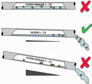 - Si la pente recommandée est augmentée, le débit d'eau sera trop élevé. Cela menace de rompre les drains au fil du temps dans certaines zones sous l'influence de la pression.Soit l'eau à grande vitesse ira au point de rejet, et des impuretés plus lourdes (grains de sable, particules d'argile) se déposeront au fond du circuit. Tôt ou tard, cela conduira à un blocage.