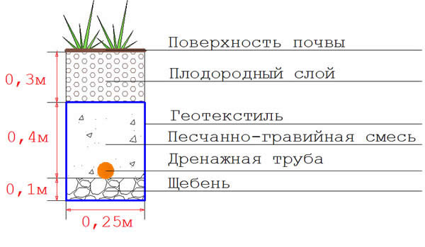 Les principaux éléments du système de drainage caché sont des drains tubulaires perforés, qui sont en outre enveloppés de géotextiles. Les paillettes de sable et de pierre concassée sont également importantes. Ils jouent le rôle d'une sorte de filtre qui empêche la pénétration de terre dans les manchons de la ligne.