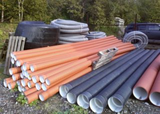 Pour le dispositif d'assainissement externe, des tuyaux en fonte et en polymère sont utilisés, pour les puits d'inspection - des produits en béton armé de grande section. Les tuyaux en fonte sont solides et durables, mais ne tolèrent pas les charges de choc. Des difficultés surviennent lors de leur installation et de la recherche de ferrures de configurations adaptées.