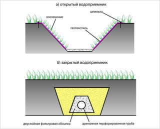 Un système de collecte ponctuelle des eaux de pluie se compose d'entrées d'eaux pluviales par lesquelles l'eau pénètre dans les tuyaux. Pour éviter de boucher l'averse, par le dessus les rainures et les plateaux sont recouverts de grilles qui retiennent les branches d'arbres et les débris. Parfois, avant d'entrer dans le système de drainage, des pièges à sable sont installés.