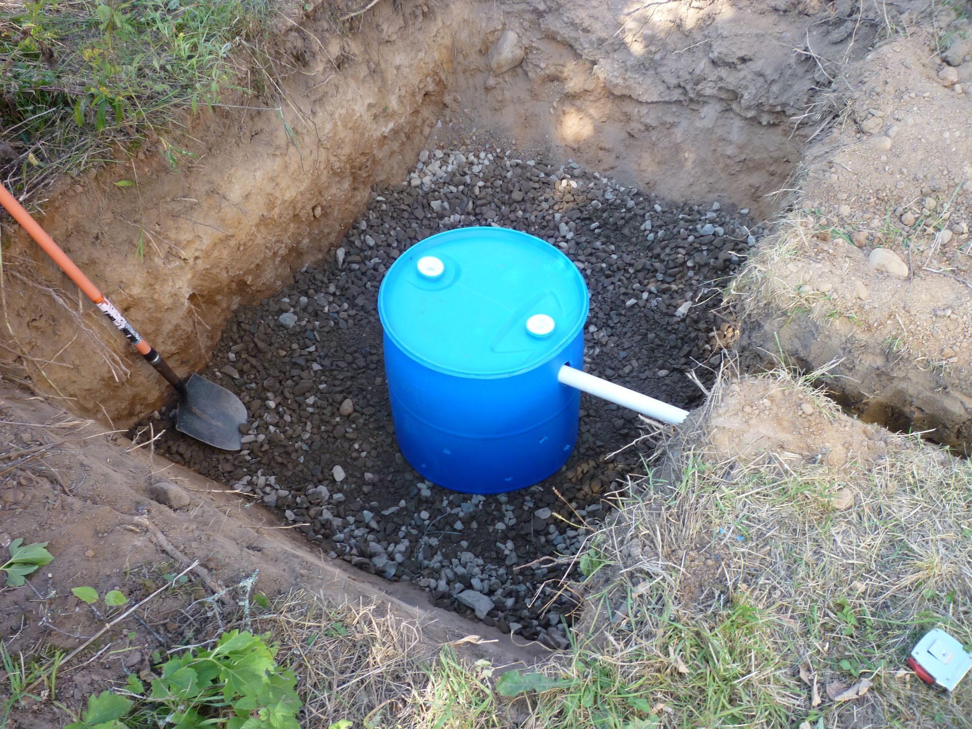 Après l'installation du baril, les murs sont scellés à l'extérieur avec de la terre. Pour protéger contre la rupture du réservoir, de l'eau doit être versée dans le baril au fur et à mesure que la terre est versée. A la fin, l'eau est retirée. La dernière étape consiste à amener les tuyaux de drainage jusqu'à la fosse.