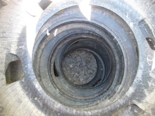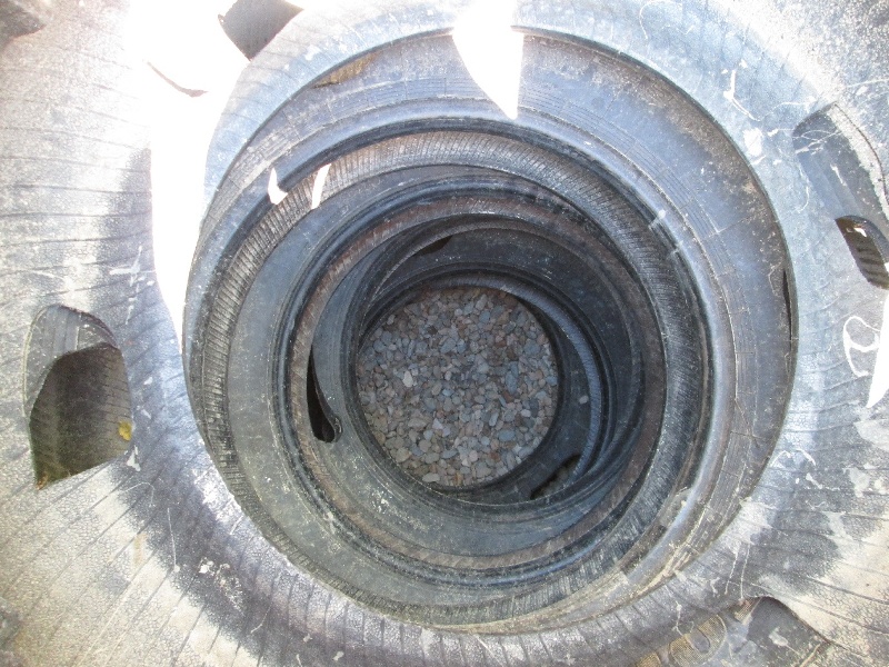- Les pneus sont empilés les uns sur les autres et fixés. Dans le pneu le plus haut sur le côté, il est nécessaire d'aménager un trou pour un tuyau de vidange.