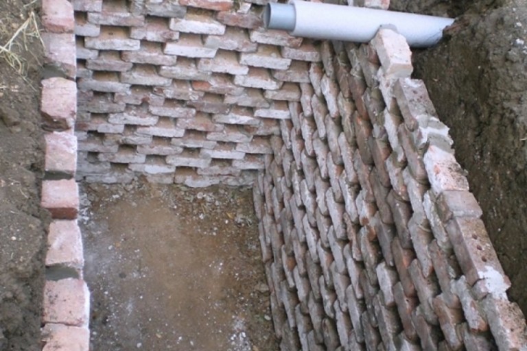 - L'étape suivante consiste à creuser une fosse de n'importe quelle forme. Il est important de ne pas oublier de préparer immédiatement une tranchée pour la pose de canalisations d'égout à une profondeur de 55 cm. Le fond doit être rempli de mortier de ciment sur une profondeur de 10 cm. Les murs en briques sont enduits et recouverts de mastic bitumineux. D'en haut, la fosse est fermée avec une chape en béton armé. Après séchage, la chape doit être recouverte de tout matériau imperméabilisant et recouverte de terre.