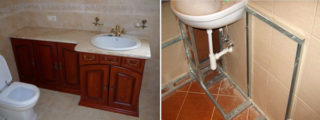 Une autre façon de cacher la tuyauterie des regards indiscrets est d'utiliser des meubles de salle de bain. Les éviers avec bordure, les armoires suspendues sur une colonne montante, les tables pour ranger le linge, les serviettes et les produits chimiques ménagers ont fière allure. Cette méthode est bonne dans les cas où la zone de la salle de bain vous permet de parcourir l'imagination du design. Ici, vous pouvez créer un intérieur intéressant et déguiser soigneusement le pipeline.