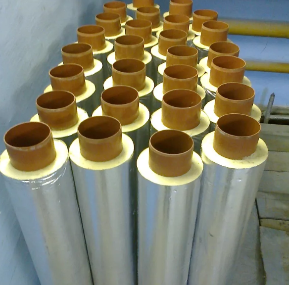 La coque en mousse de polyuréthane est un matériau qui n'est pas sensible à l'humidité. Durée de vie jusqu'à 25 ans. Il est fait sous la forme de moitiés qui ont une serrure. Ils s'habillent à tour de rôle et se renforcent avec du ruban adhésif. Sur le dessus, il y a une isolation thermique supplémentaire sous la forme d'une couche de film.