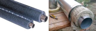 La mousse de polystyrène isolante (mousse) est produite sous la forme d'enveloppes ou de coques préfabriquées d'un certain diamètre. L'installation est effectuée indépendamment - la moitié de la coque est placée sur le tuyau avec un décalage l'une par rapport à l'autre et fixée avec du ruban adhésif spécial. Les joints sont également isolés avec du ruban adhésif et des coques profilées sont utilisées pour isoler les virages et les nœuds. Les cylindres peuvent déjà être fabriqués avec une couche de film, ce qui confère au matériau des propriétés d'isolation thermique accrues.
