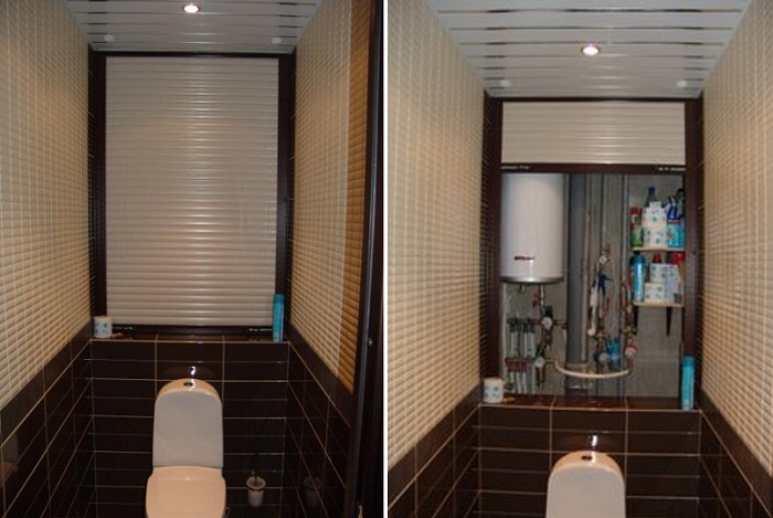 Afin de permettre l'accès aux compteurs d'eau sans la pose compliquée de la fenêtre, seule la partie inférieure du caisson est gainée de panneaux, et des volets roulants ou stores sont installés en haut à la place des portes. La structure mobile a un cadre et un rouleau de panneaux de déroulement à la base. Un bouton-poussoir ou une télécommande ouvre rapidement l'accès aux communications. Le matériau à partir duquel les volets sont fabriqués est résistant à l'humidité, ils peuvent donc être utilisés dans des pièces très humides.