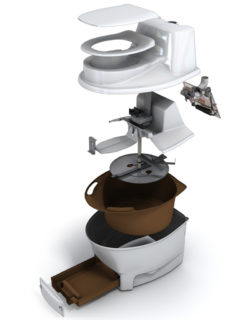 Installé n'importe où, sans odeur, conçu pour une famille jusqu'à cinq personnes. L'appareil contient un sac biodégradable qui peut être composté avec d'autres déchets.