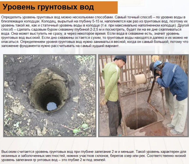 La première méthode est la plus simple. Si quelqu'un dans le quartier a déjà équipé le système d'égout local de ses propres mains, il vous indiquera le niveau d'occurrence des sources souterraines.