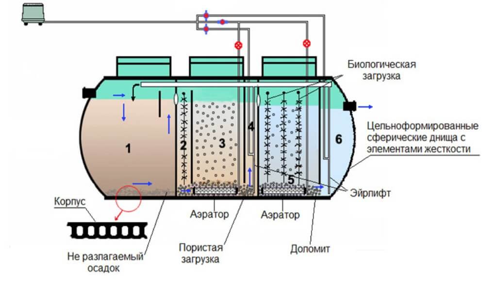 - Fosse septique pour traitement biologique. Ici, des préparations bactériennes sont utilisées pour transformer les eaux usées en matière organique - boues et eau. Un tel réservoir doit être connecté à l'électricité, car les bactéries ne fonctionnent que dans des conditions de température positive.