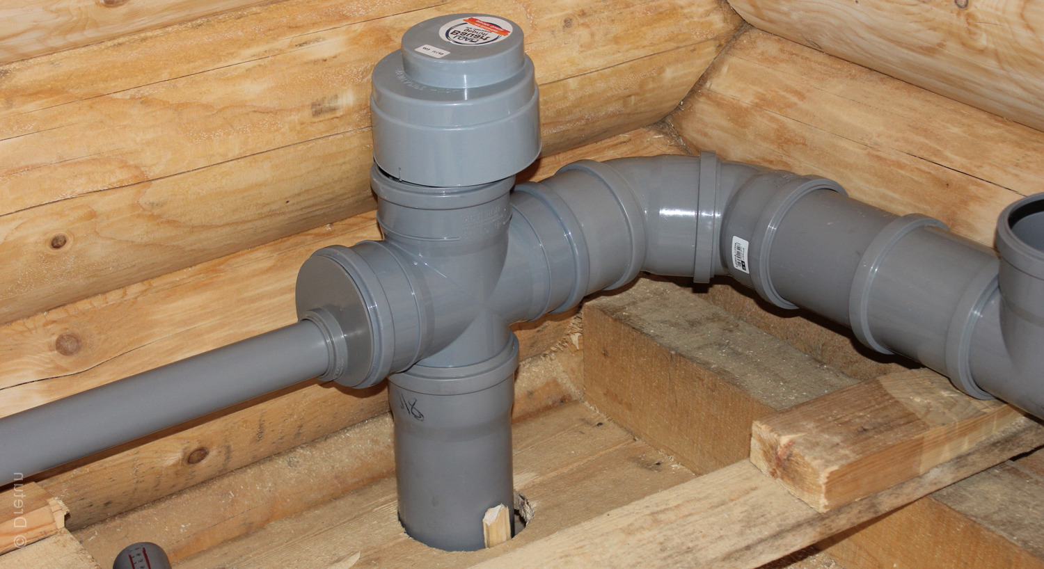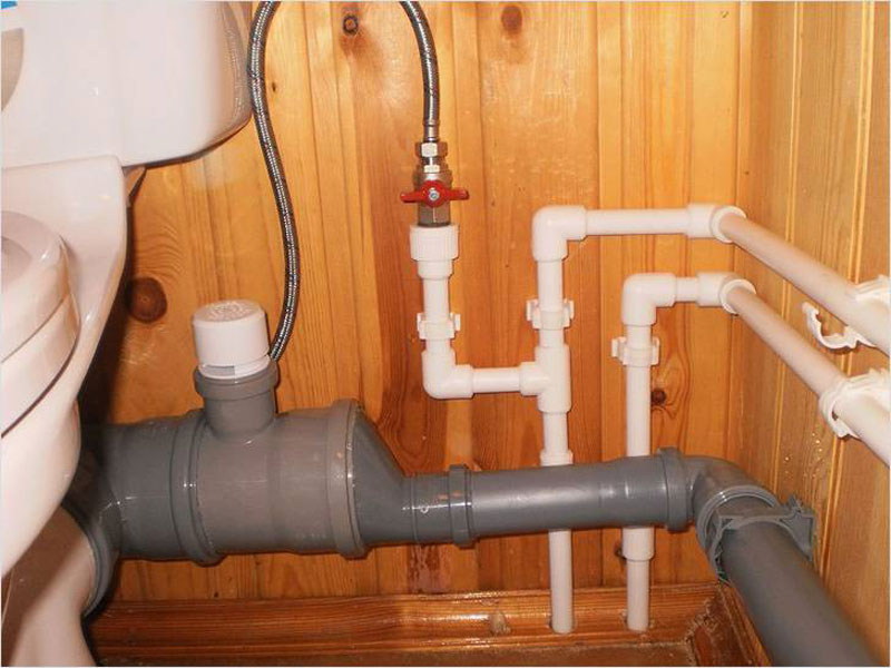 Vous devez installer un système d'égout domestique de l'intérieur. Dans toutes les pièces équipées de plomberie (cuisine, salle de bain, piscine, sauna), des canalisations sont installées vers la contremarche. Le câblage est réalisé à partir de tubes d'un diamètre de 50 mm. Un tuyau d'une section de 110 mm est connecté aux toilettes.