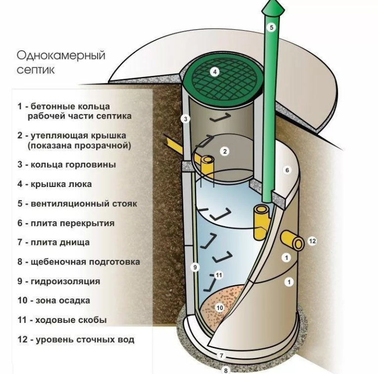 - Une fosse septique à chambre unique est un puisard avec un fond et des parois scellés. À condition que le réservoir soit complètement rempli, il est nécessaire de pomper les eaux usées à l'aide d'un équipement d'égout. Il est possible de réaliser un fond drainant/filtrant au niveau d'une fosse septique à chambre unique. Ainsi, l'eau ira dans le sol. Mais ici, il faut faire attention : si le niveau de la nappe phréatique est élevé sur le site, il y a un risque de contaminer les puits d'abreuvement à proximité. De tels actes sont punissables par la loi.