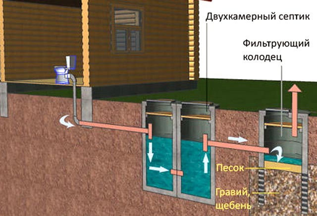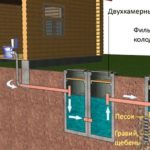- Fosse septique à deux chambres. Représente deux réservoirs adjacents. Le premier a un volume plus important que le second. Les eaux usées descendent du collecteur jusqu'au récepteur principal, où elles se déposent. De grosses particules de débris (excréments, papier) se déposent au fond. L'eau clarifiée est versée dans un second réservoir et s'y égoutte dans le sol. Le fond du deuxième accumulateur est composé de sable et de pierre concassée. Pour éviter de l'envaser, il est préférable de changer le remplissage tous les 4-5 ans. Le premier réservoir est nettoyé tous les 1-2 ans.