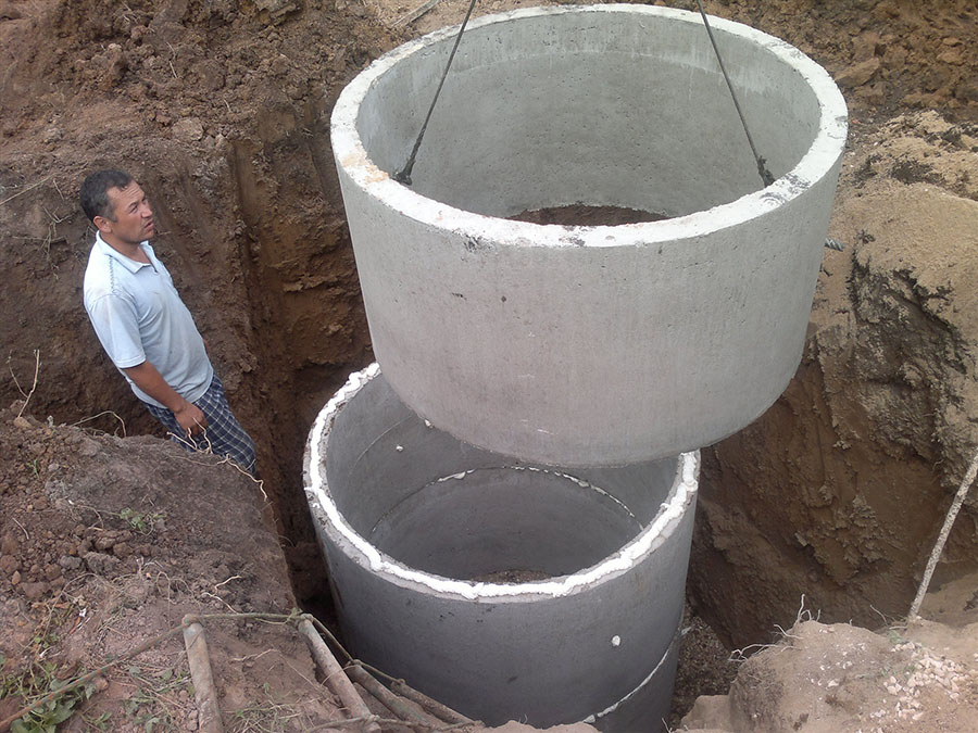 Au fil du temps, la brique a commencé à être remplacée par des anneaux de béton. Un tel matériau dure plus longtemps et ne laisse pas passer les liquides et les odeurs. C'est plus rapide à monter : il faut creuser une fosse de la bonne dimension et utiliser une technique pour installer les anneaux. Pour sceller l'espace entre les composants, du ciment est utilisé.