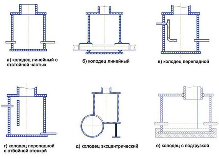 La chambre de travail est équipée de supports en fer (marches), le long desquels les travailleurs descendent à l'intérieur. Le schéma du dispositif de puits d'égout dépend des fonctions de la ligne. S'il s'agit d'un système domestique, le schéma sera simplifié. S'il est industriel, avec diverses ramifications et biais, le circuit en aura besoin d'un plus complexe et fonctionnel.