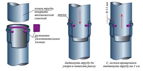 Un morceau d'eaux usées provenant de tuyaux en PVC d'une section transversale de 150 mm est monté dans la prise - chaque morceau suivant de la ligne est inséré séquentiellement dans le précédent (dans sa partie large). Ils agissent ainsi :