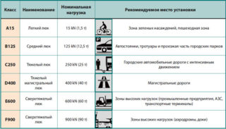 - Dans les zones piétonnes des lieux publics, des produits légers mais plus massifs pesant jusqu'à 60 kg sont installés. La charge nominale est également de 15 kN. Marquage - A15 L.