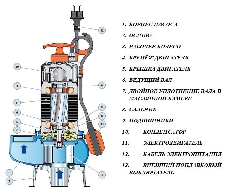 Les pompes submersibles pour eaux usées fonctionnent dans un milieu liquide. L'indicateur de niveau de liquide est un mécanisme à flotteur qui éteint l'appareil et le protège de la marche à sec. Dans ce cas, le corps est complètement dans l'eau et s'en refroidit. Fait de matériaux durables résistants à la corrosion. Le câble électrique est dans une gaine de protection pour éviter les courts-circuits.