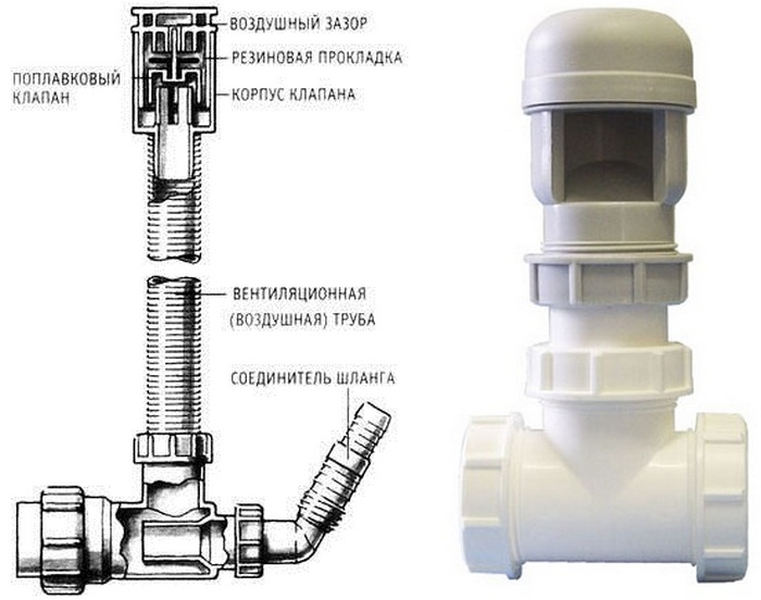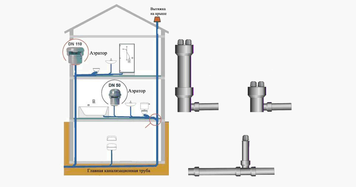 - Longs tuyaux horizontaux du collecteur, dans lesquels il existe une prédisposition à l'évacuation des eaux usées par volée. C'est plus fréquent dans les toilettes publiques. Pour éviter que le joint hydraulique ne soit arraché à la suite de décharges d'eaux usées, des aérateurs sont installés tous les 3 à 4 mètres du collecteur.