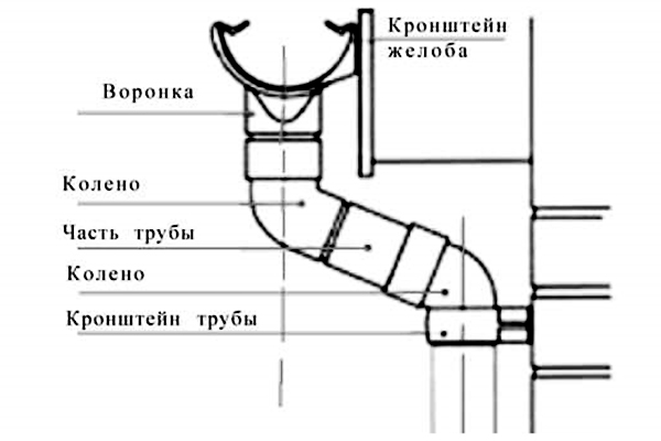 - La partie verticale du système de drainage est fixée aussi près que possible du mur - à une distance de 3 à 5 cm, mais l'entonnoir de collecte de l'eau est plus éloigné de la verticale. Vous ne pouvez les connecter qu'avec une paire de genoux.