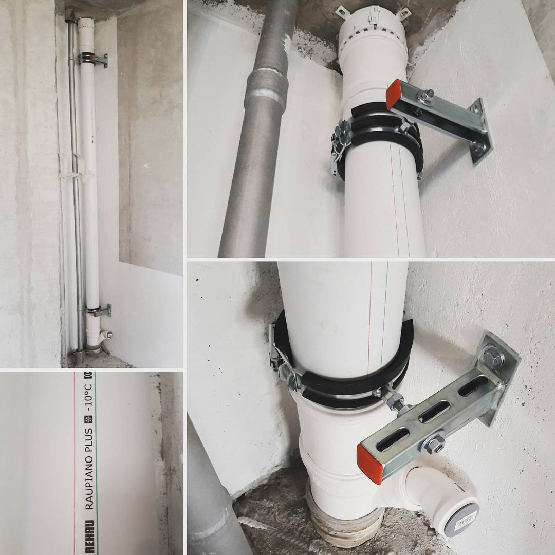- L'emplacement des montures. Les fixations sont installées là où les coudes principaux d'égout, les dérivations, ainsi qu'aux endroits où les éléments de renforcement et les nœuds de connexion sont installés. Afin de calculer correctement l'emplacement des pinces, une élaboration préliminaire d'un schéma général de pose de la conduite d'égout avec toutes les branches sera nécessaire. Le dessin peut être transféré directement sur les murs de la pièce.