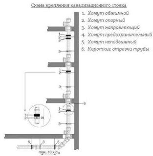 - Fixations antidérapantes et flottantes en alternance. Chaque section de tuyau doit être sécurisée avec au moins un collier fixe rigide. Il est situé à la base du tuyau, où il se connecte au reste du système d'égouts. Dans ce cas, des pinces flottantes doivent également être installées - des deux côtés de la pince fixe.