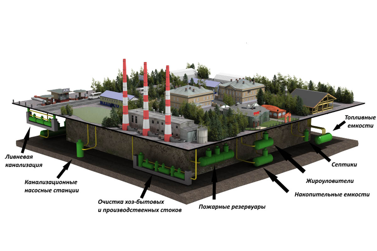 Sur les territoires des installations industrielles et des stations-service, la fonte et les eaux de pluie s'accumulent dans des réservoirs, puis elles sont pompées et sorties des limites pour être rejetées dans le sol ou les plans d'eau.