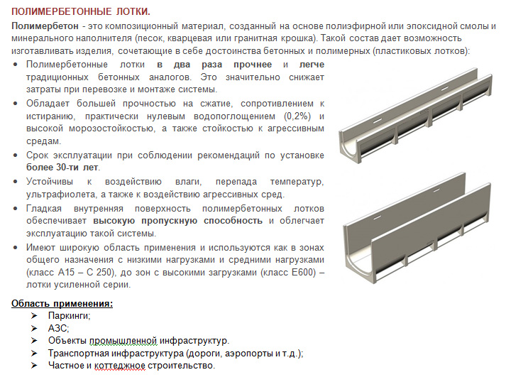 En plus des gouttières en béton/plastique, les plateaux en béton polymère sont fabriqués en stricte conformité avec GOST. De ce fait, les produits allient la résistance de la pierre et la plasticité des polymères. De telles gouttières sont utilisées dans les domaines suivants :
