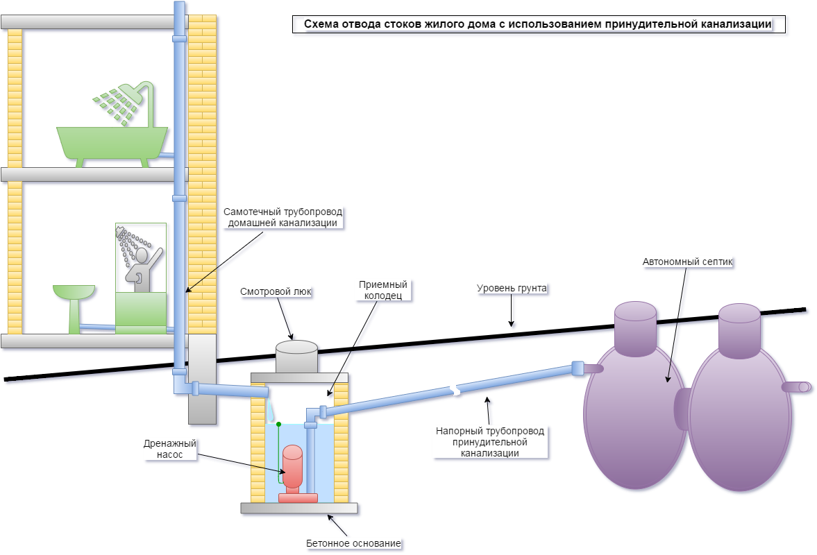 En règle générale, un système d'égouts individuel dans une maison de campagne est aménagé selon le principe de la gravité. L'effluent est envoyé à la fosse septique par gravité sous une pente. Si, pour un certain nombre de raisons, il n'est pas possible d'aménager un tel collecteur, un système d'égouts sous pression est nécessaire. Un tel système envoie de force les eaux usées au point de collecte à l'aide d'une pompe spéciale.
